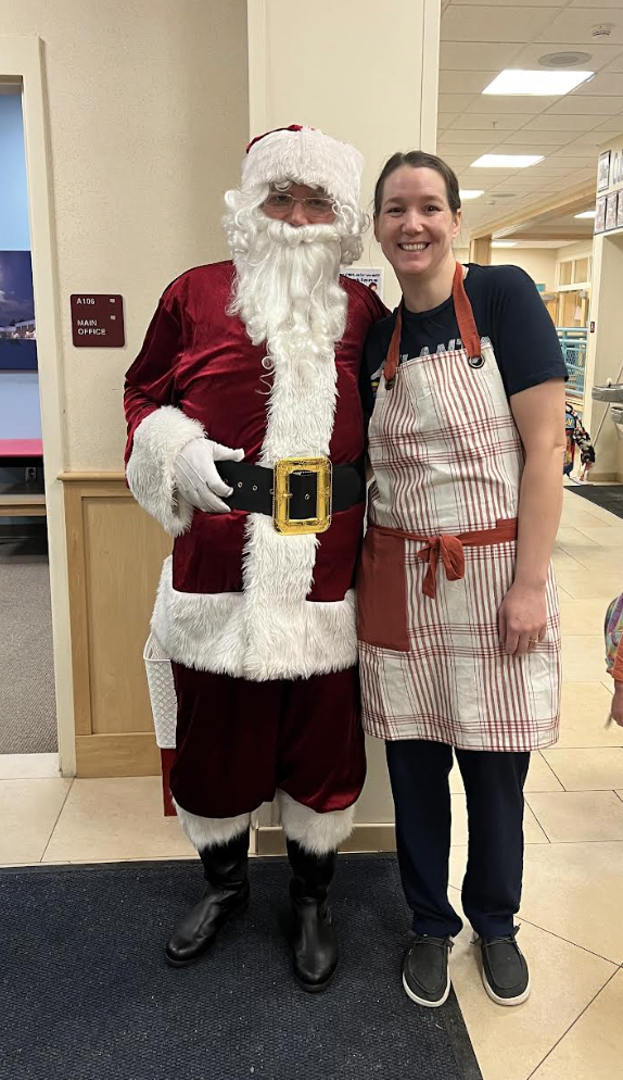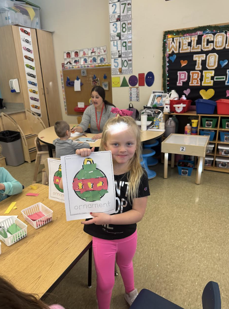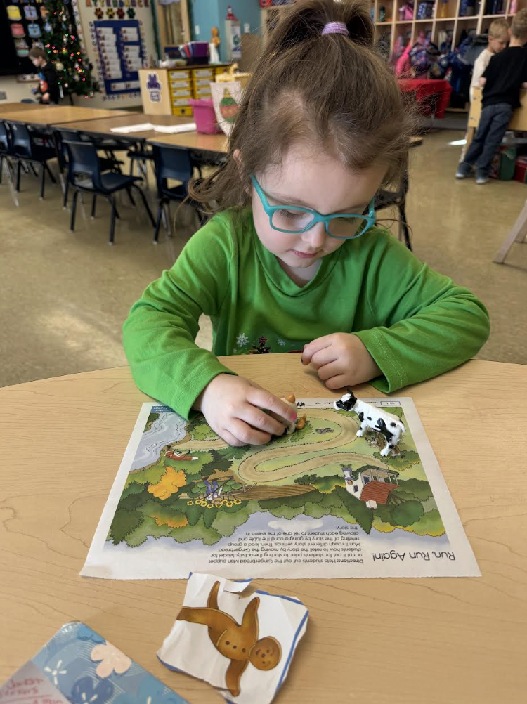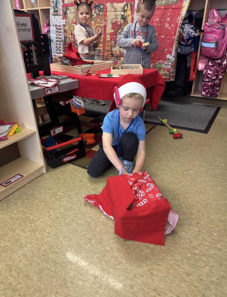 Picture 2 the dramatic play area has become Santa's workshop. This elf is wrapping a gift.