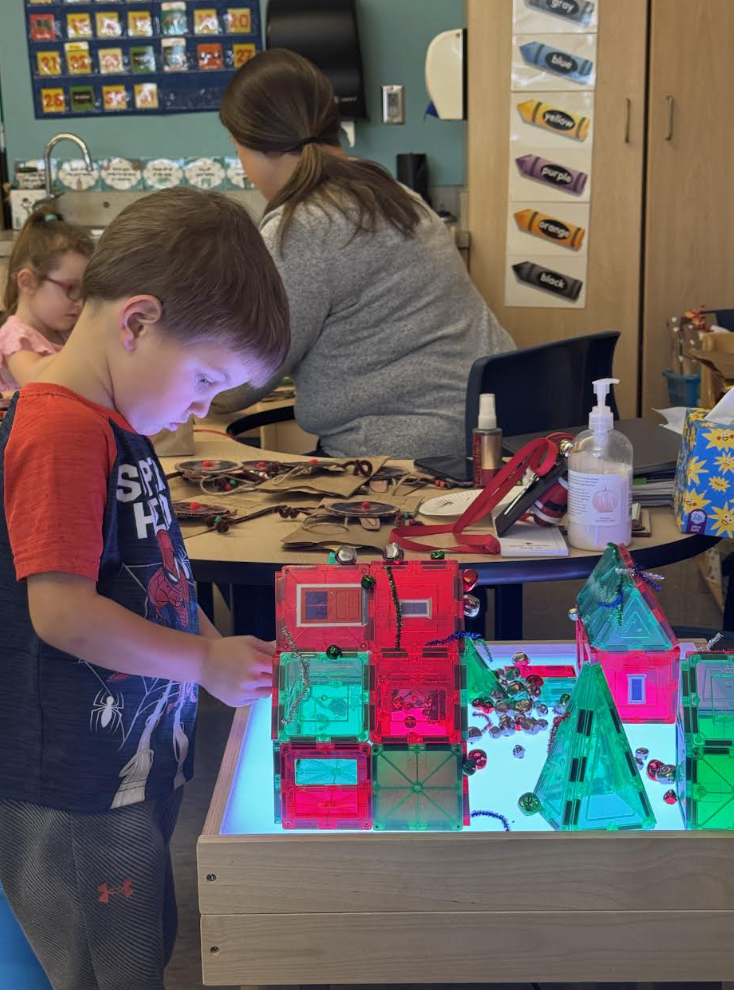 Picture 3 decorating the Magna tile houses set up on the light table with tinsel and bells.