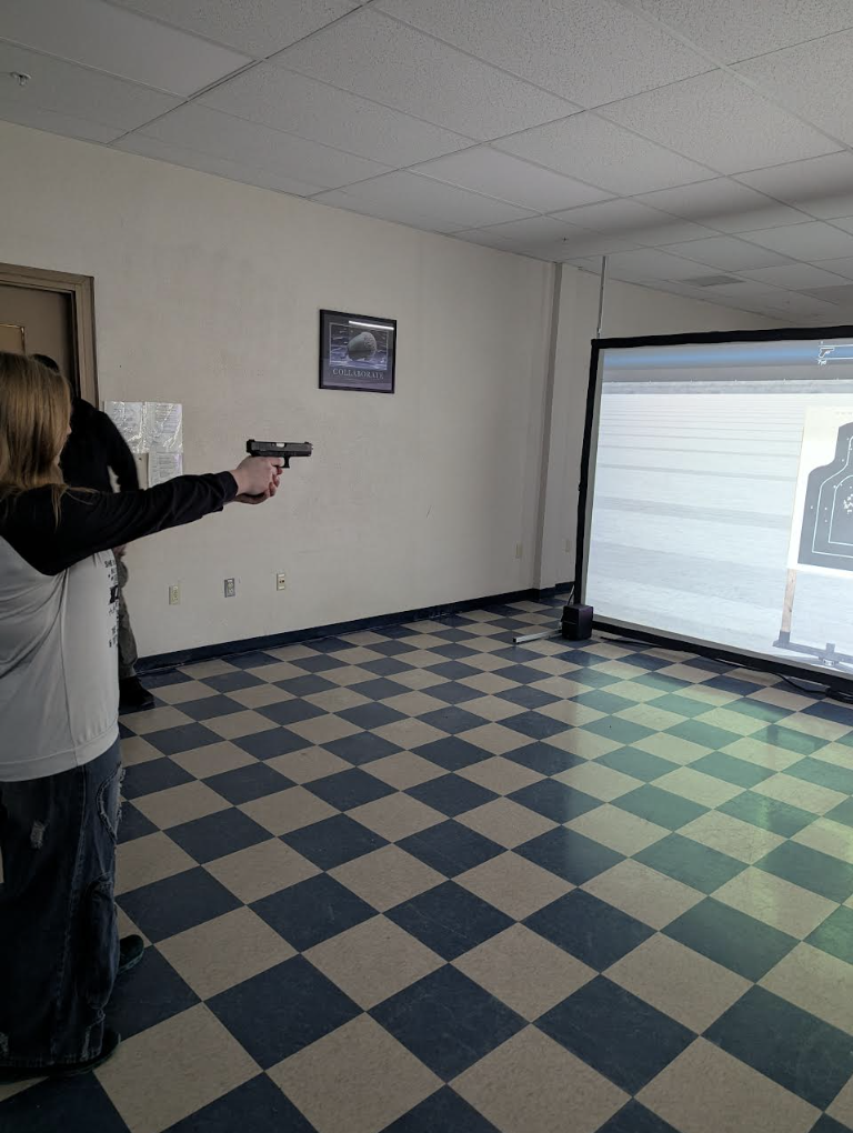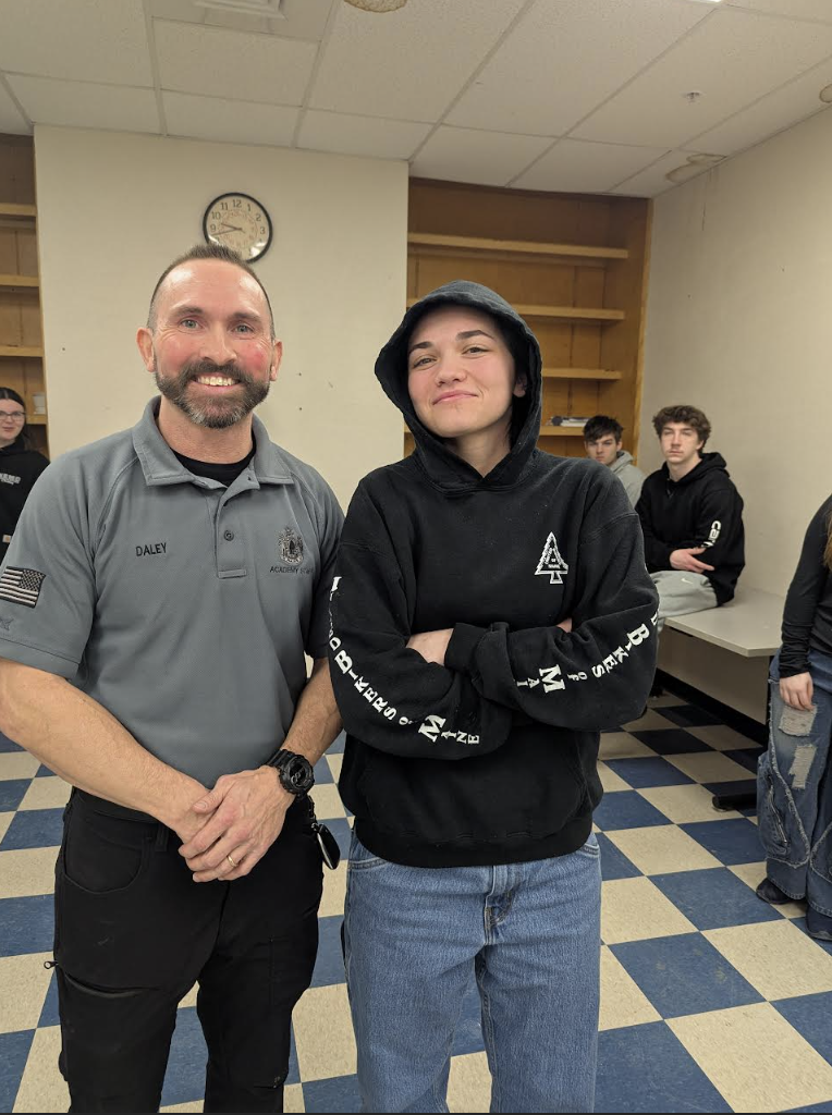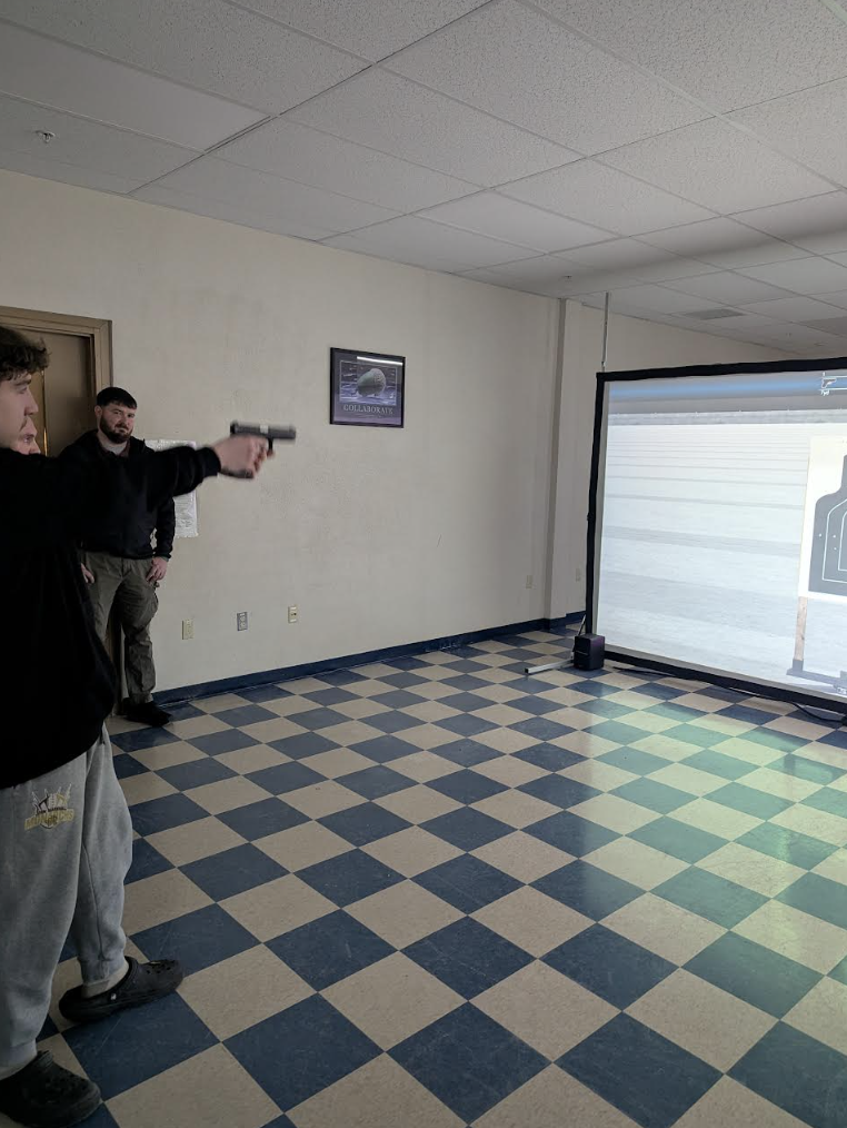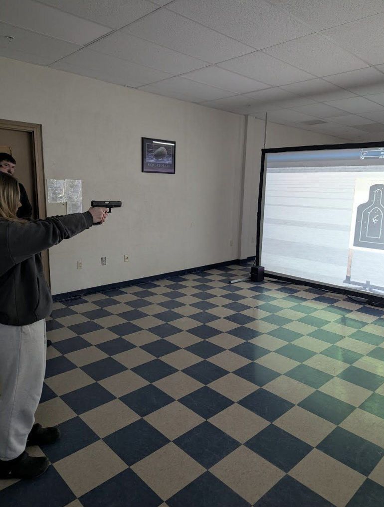 JMG and ELO visited the Maine Criminal Justice Academy in Vassalboro. Instructor Daley (pictured with Dirigo JMG Senior, Keira Reny) was a Dirigo Grad, himself! He showed his fellow Cougars how to shoot on the simulator. |