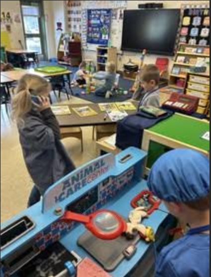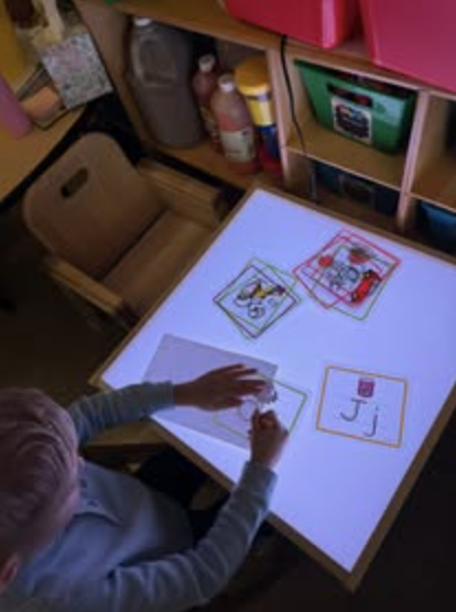 Group completed this floor puzzle during afternoon centers. Working on book skills before going to a special. Tracing letters using the light table Building on our Animals domain, we have an animal care center set up in the dramatic play area. This student is doing an examination! |