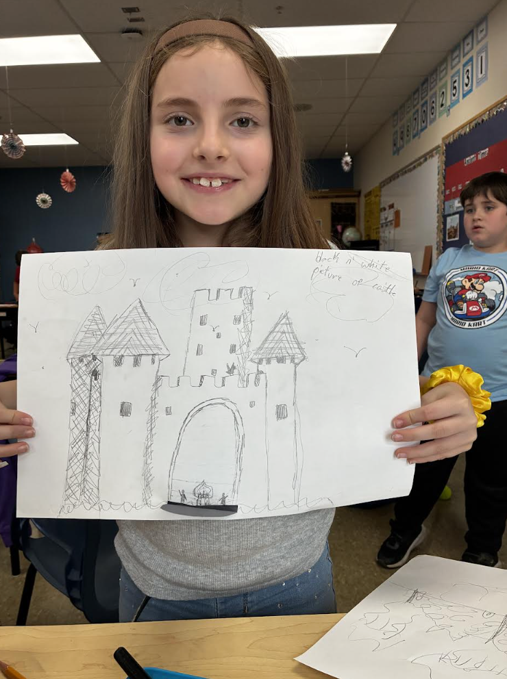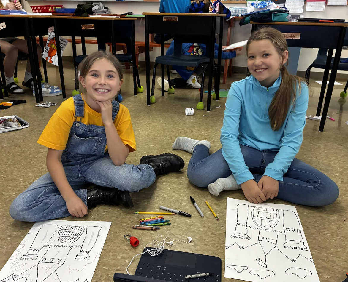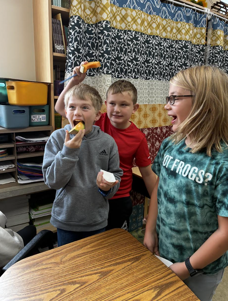 4th graders working on castle picture for Middle Ages project. And 4th graders enjoying the fruit of the day (was the first day of it). by Marilee Colpitts |