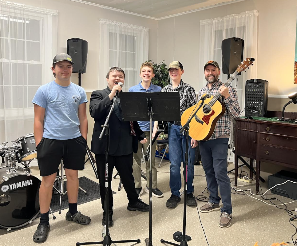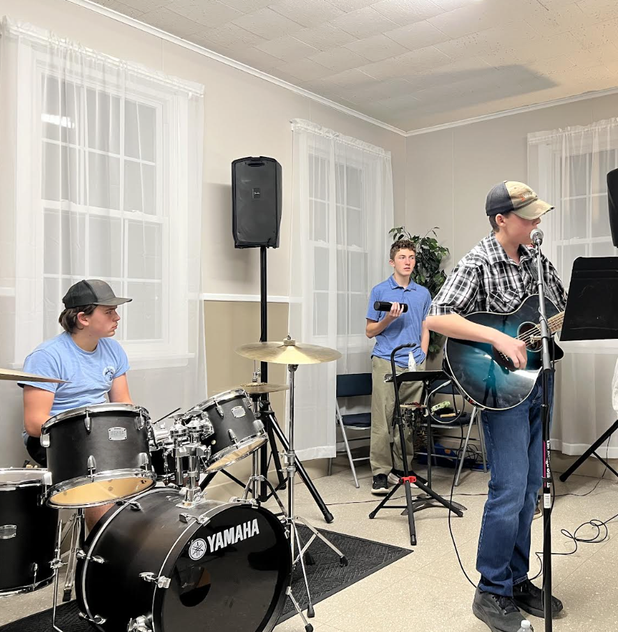 Students from Dirigo High School, Spencer Cox, Ethan Knowles and Max Giberson, performed along with Mr. Hamalainen at a recent Coffeehouse at the "Church on the Hill." Former student, Isaiah Lovelace also sang a few hits. |