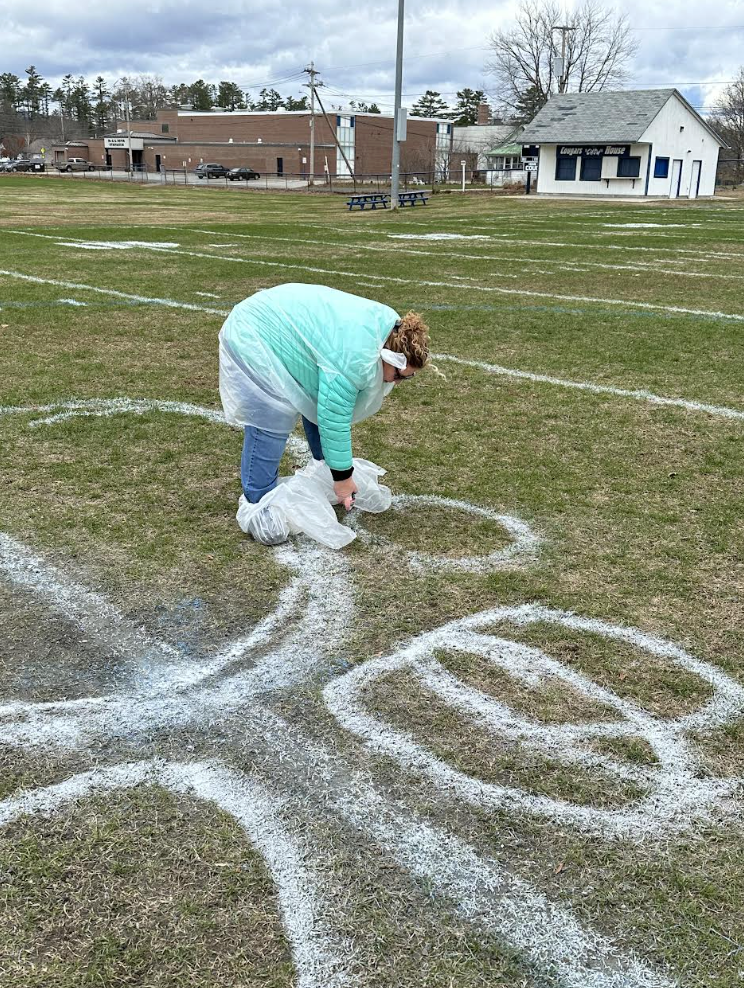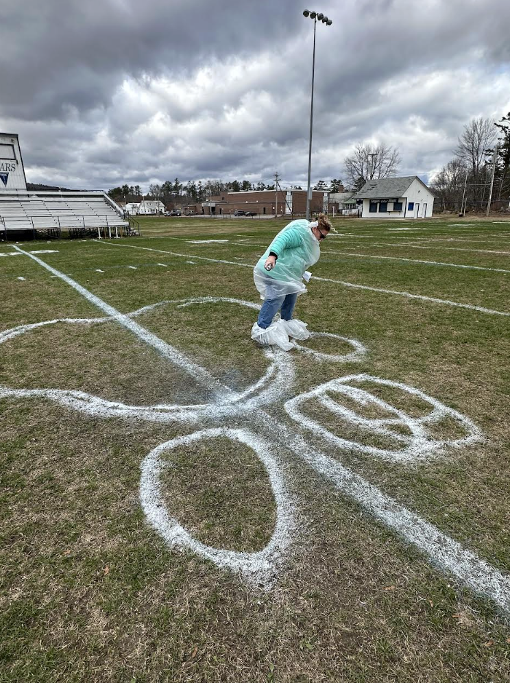 Jay (somehow) coerced Tricia into being his personal assistant in preparing the football field. |